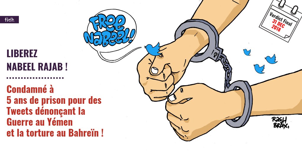 #Bahreïn: Pour de simples tweets, le militant pacifiste@NABEELRAJAB a été condamné à 5 ans de prison