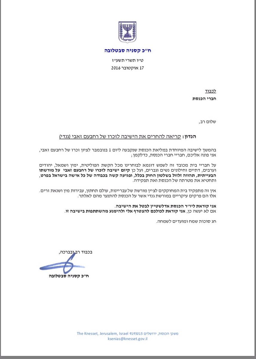ח"כ קסניה סבטלובה (מחנ"צ) נגד מורשת גנדי: תובעת מיו"ר הכנסת לבטל את ישיבת המליאה המיוחדת לזכרו ולחלופין קוראת לח"כים להחרים את הישיבהpic.twitter.com/wejD40RzYI