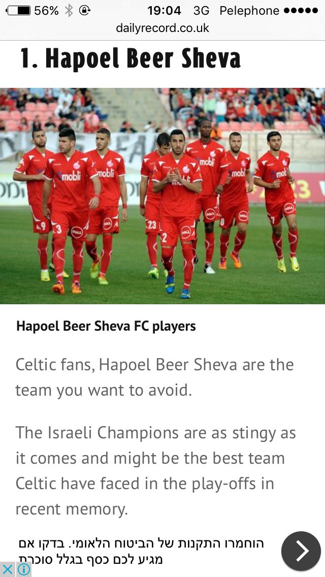 הדיילי רקורד הסקוטי מזהיר את סלטיק מהפועל בש ומכתירה כ-״יריבה הכי קשה שניתן לקבל״. אפילו יותר מדינמו זאגרב וקופנהגןpic.twitter.com/K7iH7qLkTq