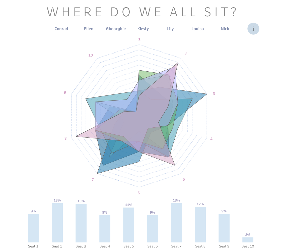 Our final challenge from our last day of the data school 💔 We had an hour and a half to visualise the data of where we all sat during our four months of training, which was meticulously recorded by . See it here: