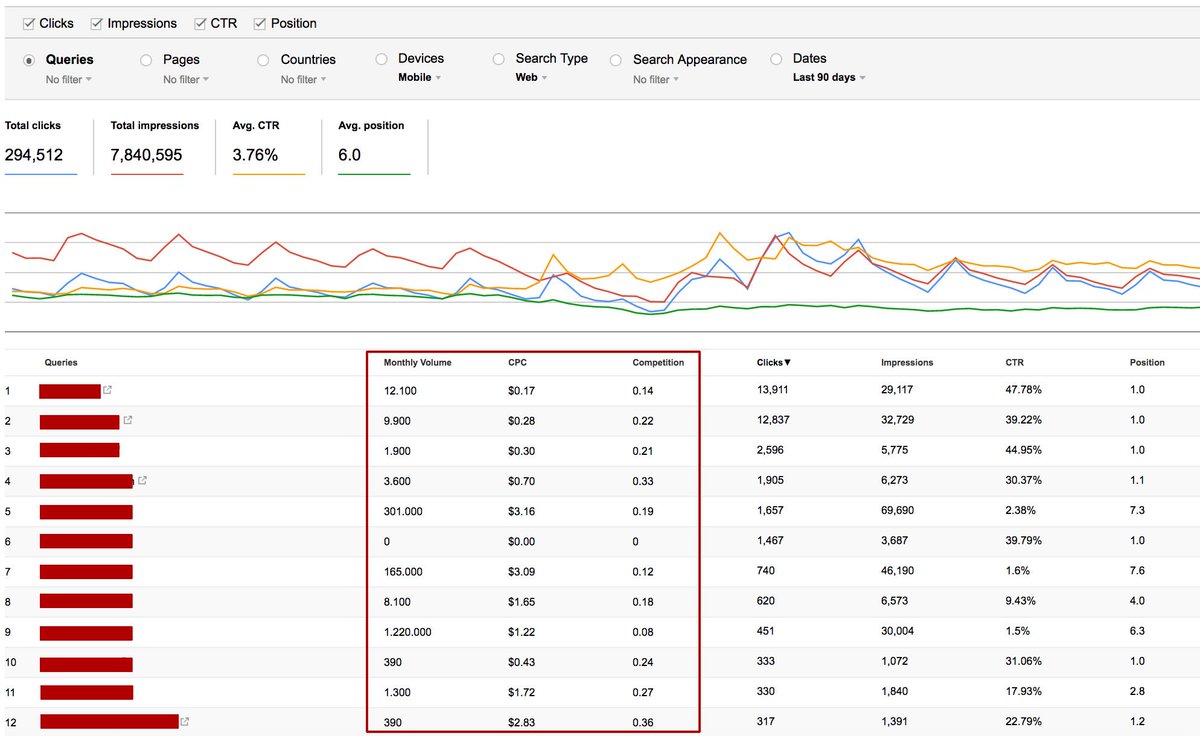 Use the Keywords Everywhere browser extension: to add kw metrics in GSC search analytics report