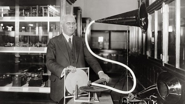 Inventor Emile Berliner with an experimental disc and Gramophone.