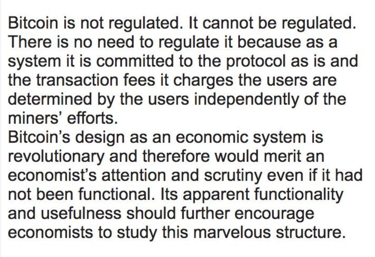 #Bitcoin is not regulated. It cannot be regulated. There is no need to regulate it because as a system it is committed to the protocol as is and the transaction fees it charges the users are determined by the users independently of the miners efforts" - Central Bank of Finlandpic.twitter.com/tcq8q18QV4