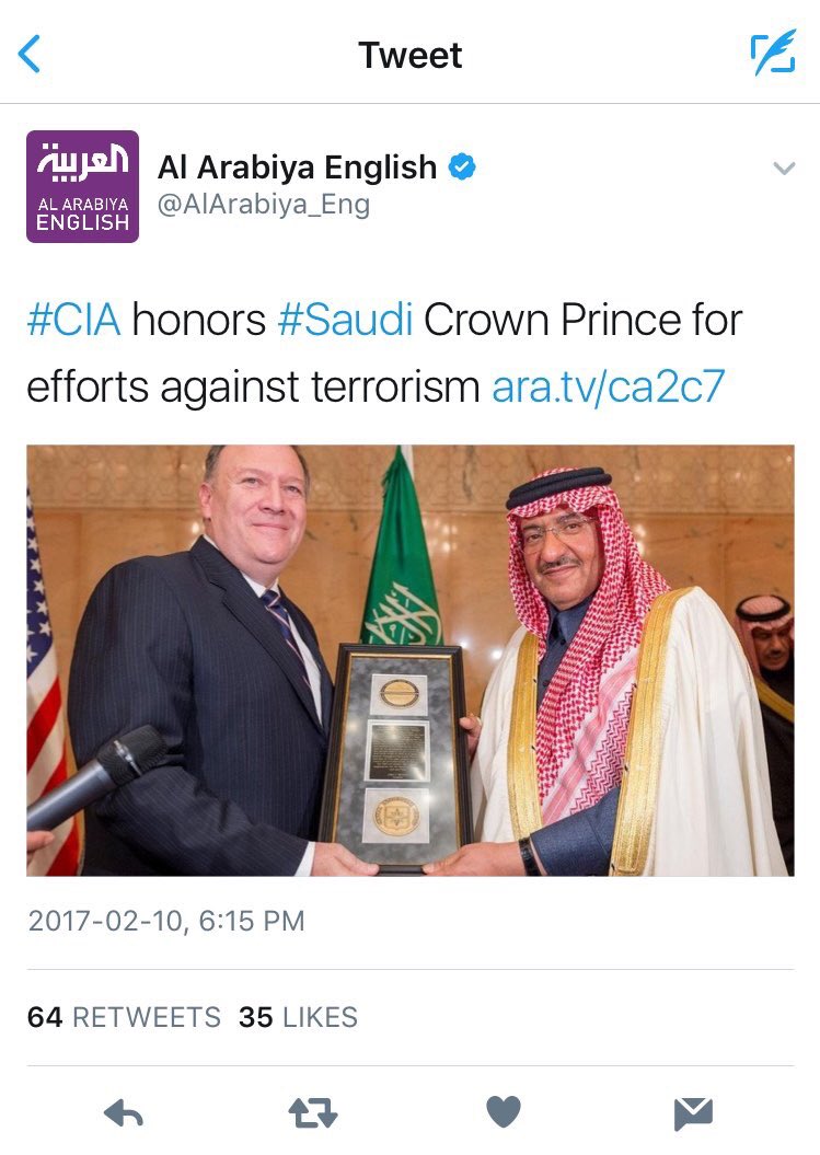 "CIA honors Saudi prince for contributions to ensure international peace" ... Dying Yemeni children aren't part of US' world I suppose ...