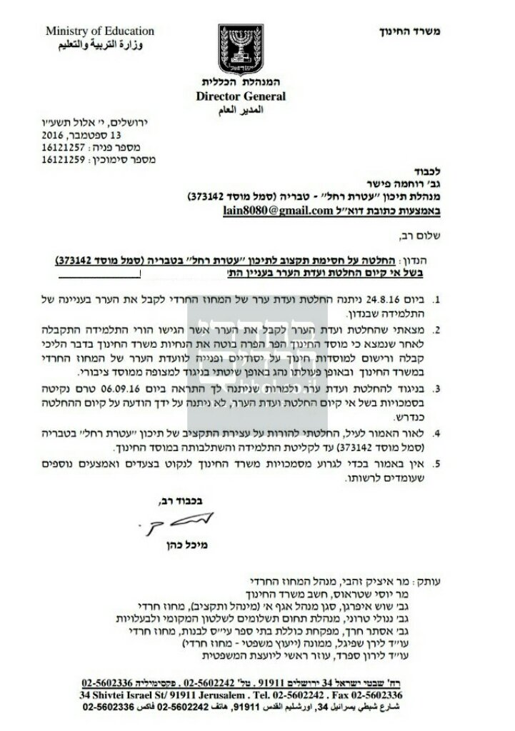 14. המכתבים ששלח המחוז החרדי ל-5 סמינרים: החלטה על חסימת תקצוב