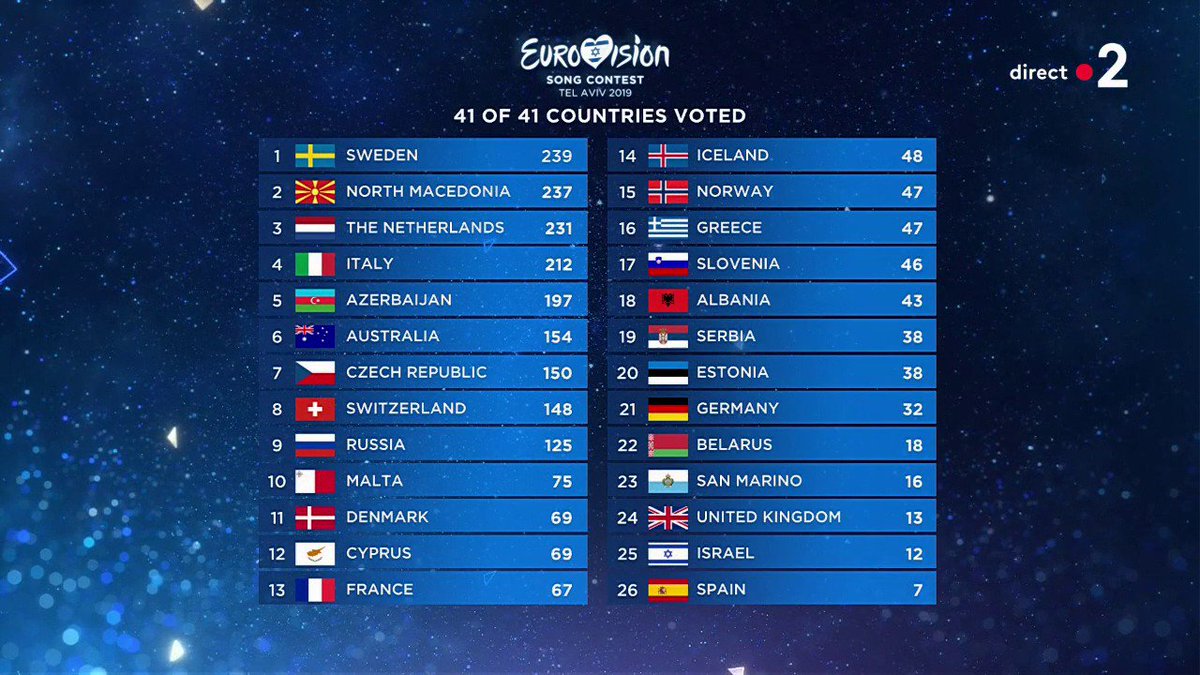 Pour l'instant, c'est la Macédoine du Nord qui est en tête de l' ! Top 5 : 1. Macédoine du Nord 2. Suède 3. Azerbaïjan 4. Italie 5. Russie Vous en pensez quoi ? 👀