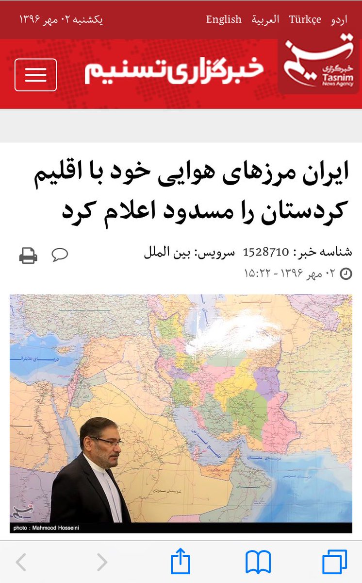 Tasnim of IRGC quotes Turkey security council that Ankara has closed its airspace to Iraqi Kurdistan