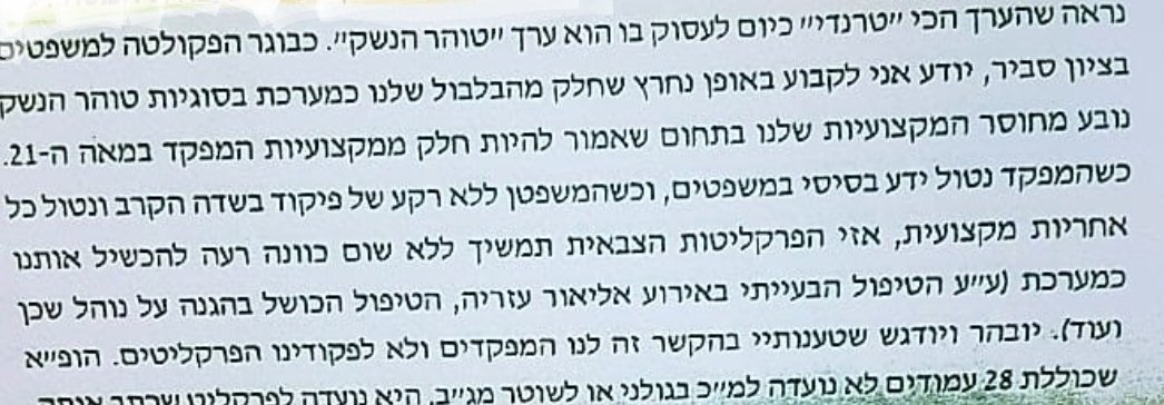 קצת נגד הזרם אבל כדאי להקשיב גם לביקורת מתוך צה"ל, לדעה אחרת, על החיכוך והפערים בין התפיסות המשפטיות והמבצעיות. מתוך מכתבו של קצין האג"ם של פיקוד מרכז עד לאחרונה, אל"מ אלון מדנס, לאלוף הפיקוד. נזכיר: מדנס, קצין מכהן, מהליבה הקרבית וצל"שניק מחומת מגן. המכתב שיקף את עמדתו הענייניתpic.twitter.com/VqqjgicJtT