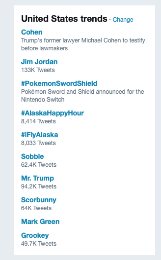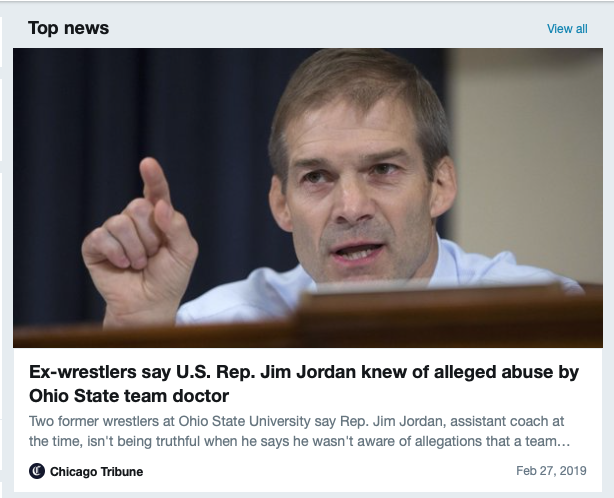 Jim Jordan is trending because of his questioning of ex-Trump attorney Michael Cohen. But Twitter says the "top news" about the congressman is a 2018 story about (unverified) allegations that he knew about college sex abuse.