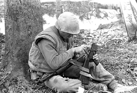 A U.S. Marine of the First Battalion, Fifth Marines cleans his M-16 rifle during a lull in the battle for the Imperial City of Hue, Feb1968pic.twitter.com/qQfsg0t0gH
