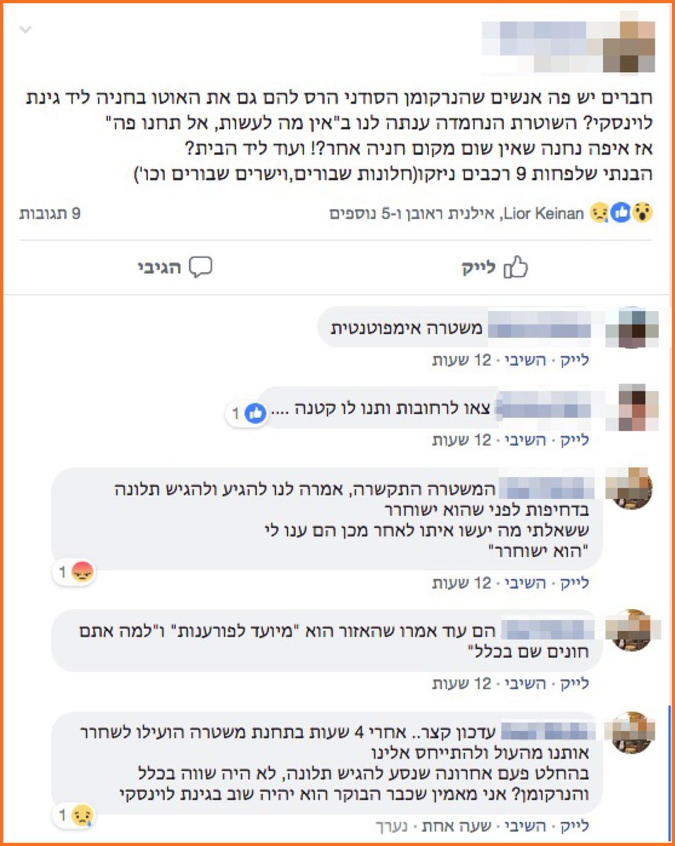 הנרקומן הסודני זניח בסיפור הזה. שימו לב להתנהלות השוטרים. שימו לב להשלמה עם אוזלת היד ואובדן השליטה. ושימו לב למה הפסקנו מזמן להגיש תלונות בתחנה. השיחה נלקחה מקבוצת הפייסבוק של נווה שאנן. לבקשת המעורבים מחקתי את השמות. אגב, אף אחד מהלטפנים שמרבים לכתוב בקבוצה לא הגיב.pic.twitter.com/kprdJCRNyO