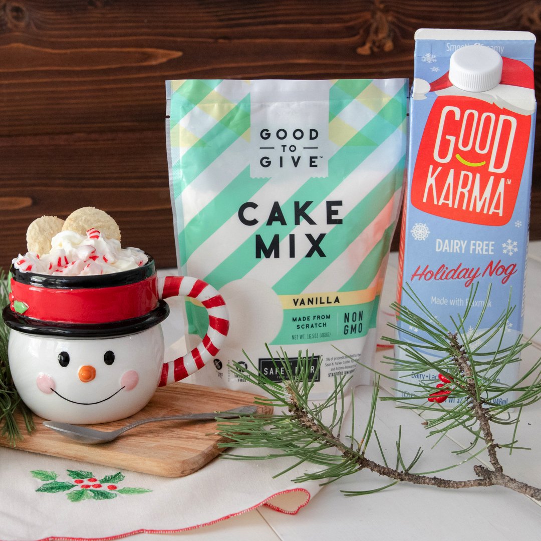 Here's a bright little idea for the holidays...Mug cakes made with Company cake mix and Good Karma Foods Holiday Nog! Get the and to make it here!
