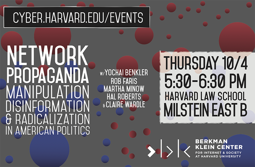 Thursday at 5:30pm | Network Propaganda: Manipulation, Disinformation, and Radicalization in American Politics, with Yochai Benkler, Rob Faris, Martha Minow, Hal Roberts, and Claire Wardle RSVP here: