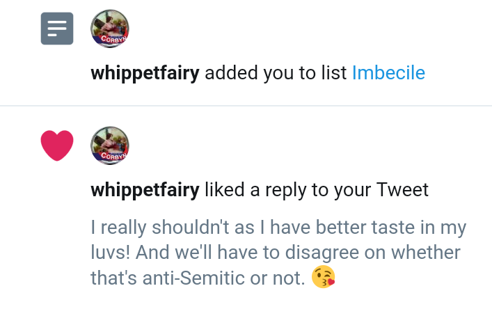 I awoke to find I'd been added to a list entitled 'Imbecile'. I guess it's better than the 'Pedophiles' list that Jewish and ally friends have been added to. The person who added me is a Corbyn fan and quite liked the misogynist guy calling for the destruction of Israel. 🤷🏻‍♀️