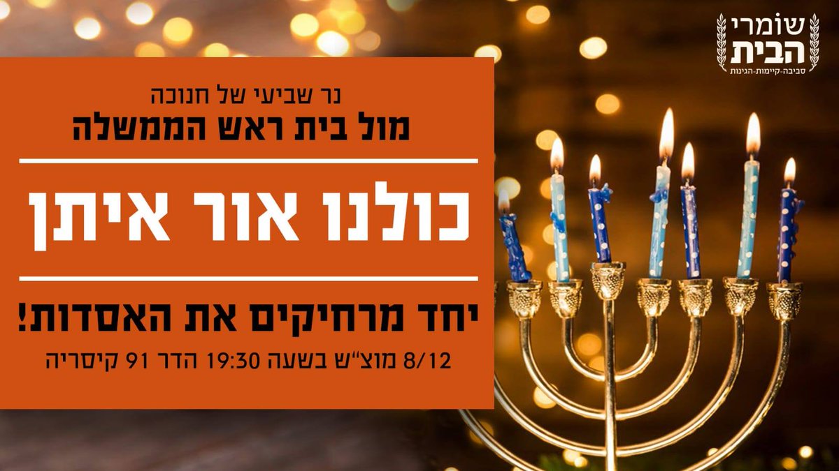 מוצ"ש מול בית ראש הממשלה: כולנו אור איתן! בחנוכה הזה נגדיל את האור שלנו כקבוצה, ונציין נר שביעי של חנוכה ביחד מול בית ראש הממשלה בקיסריה. בואו עם חברים ומשפחות להפגנת ביחד מדליקה. מוצ"ש 8/12 בשעה 19:30, הדר 91 קיסריה. בואו. ביחד מרחיקים את האסדות מהחוף!pic.twitter.com/hAxTf8HhKk