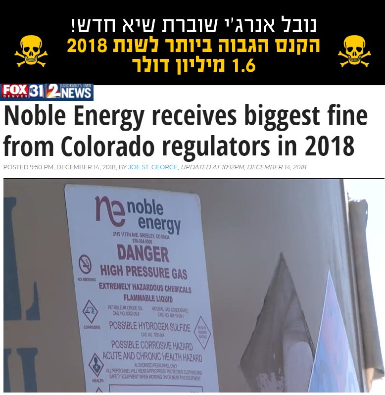 חברת נובל אנרג'י ממשיכה לשבור שיאים. והפעם "הקנס הגבוה ביותר לשנת 2018" לחברות נפט וגז בקולורדו בגין דליפות ותקלות. קנס של 1.6 מיליון דולר(!) הושת משום שנכשלה בתחזוקה ותפעול של מתקניה. שומרים על ישראל - מרחיקים את אסדות הגז - מונעים את מיכלי הקונדנסט והזרמת חומרים מסוכנים ביבשהpic.twitter.com/cT5MjNkBzQ