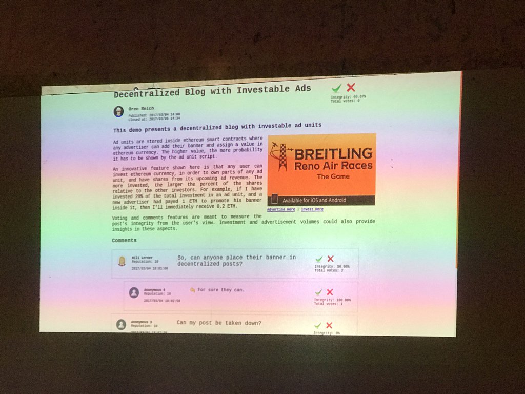 Was a great day at the Tel Aviv hackathon, working on decentralized websites via a blockchain solution (swarm, maidsafe, storj).https://twitter.com/BitcoinemBassy/status/837762790559461377 …