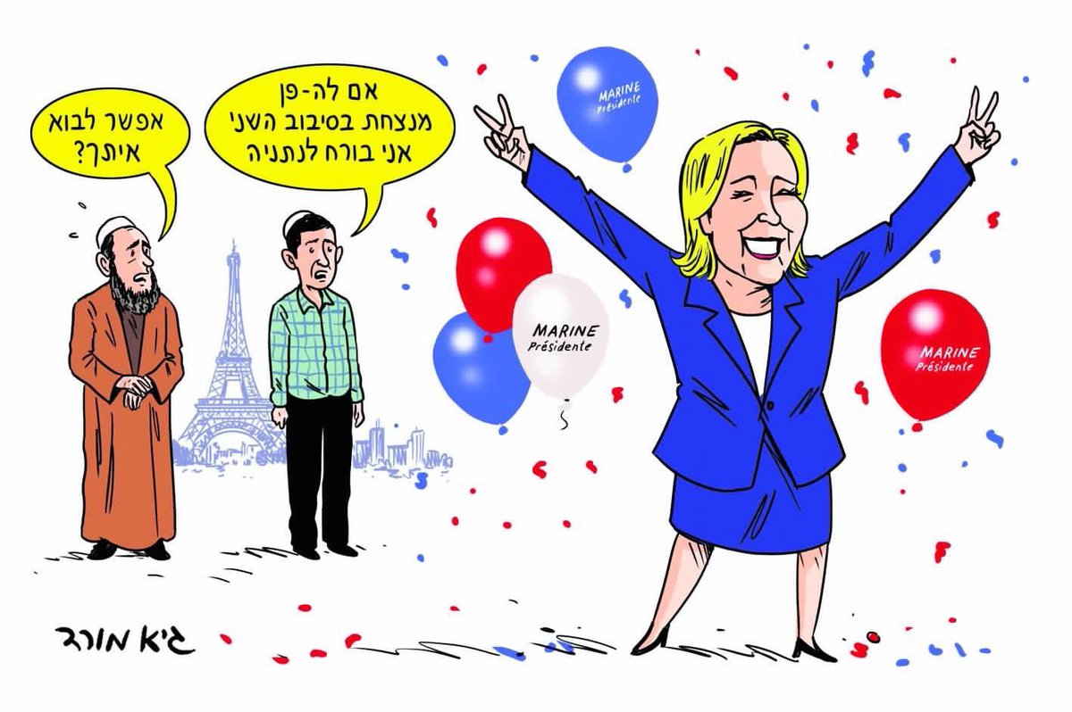 Caricature dans la presse israélienne : Le juif : "si Le Pen gagne je pars à Netanya (Israel)" Le musulman : "je peux venir avec toi ?"