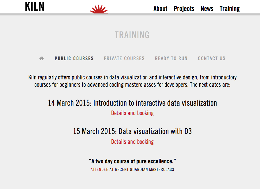 Learn D3 data visualisation with Kiln. Next course (March 15) now bookable. Only 16 places available so be quick!http://www.eventbrite.co.uk/e/data-visualisation-with-d3-tickets-15107065640 …