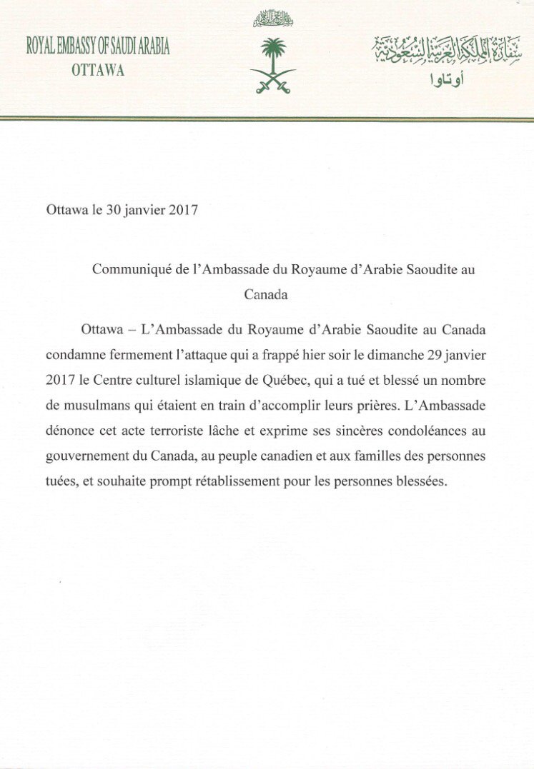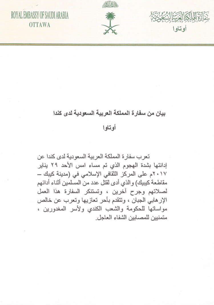 Statement of the Saudi Embassy in Ottawa concerning the attack on Quebec City mosque.