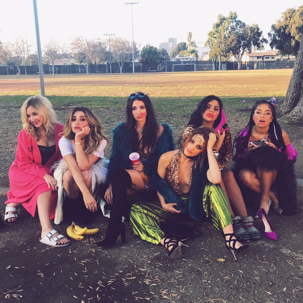 6 betches sitting on a bench