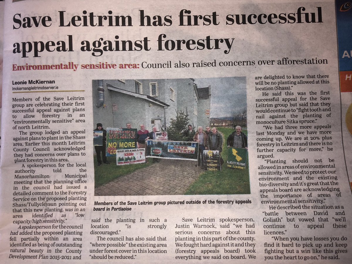 We had our first successful appeal against forestry. Read all about it in today’s Leitrim Observer.