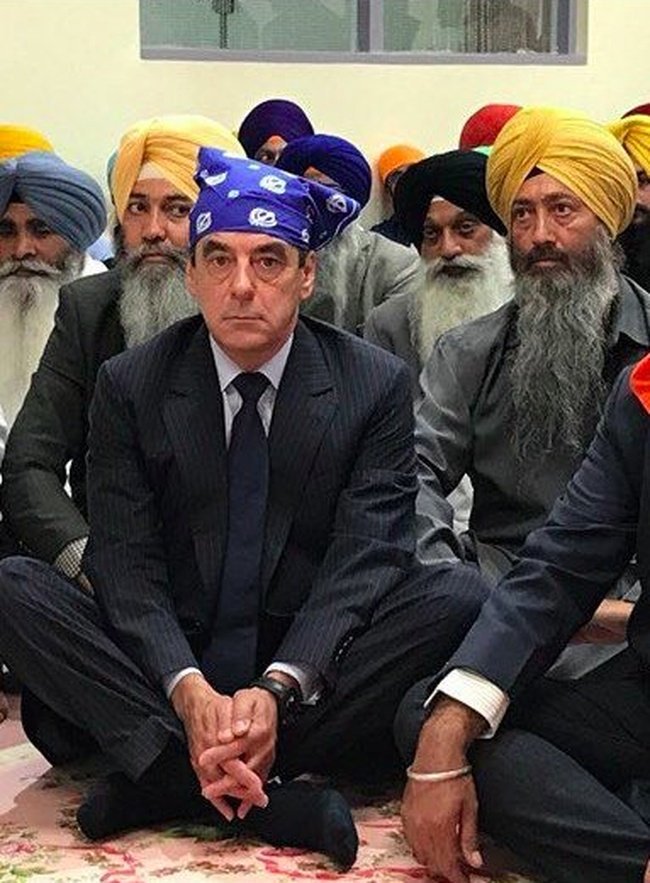 #RT si tu avais oublié cette photo géniale du 25 septembre 2016 où@FrancoisFillon avec un#turbandana de biker est au milieu de Sikhs !