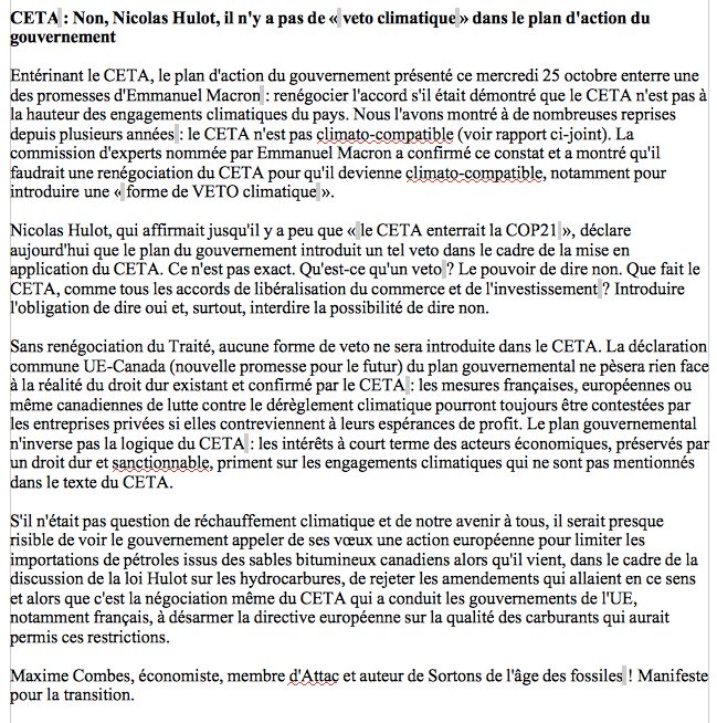 [CETA - REACTION] Non il n'y a pas de « veto climatique » dans le plan d'action du gouvernement