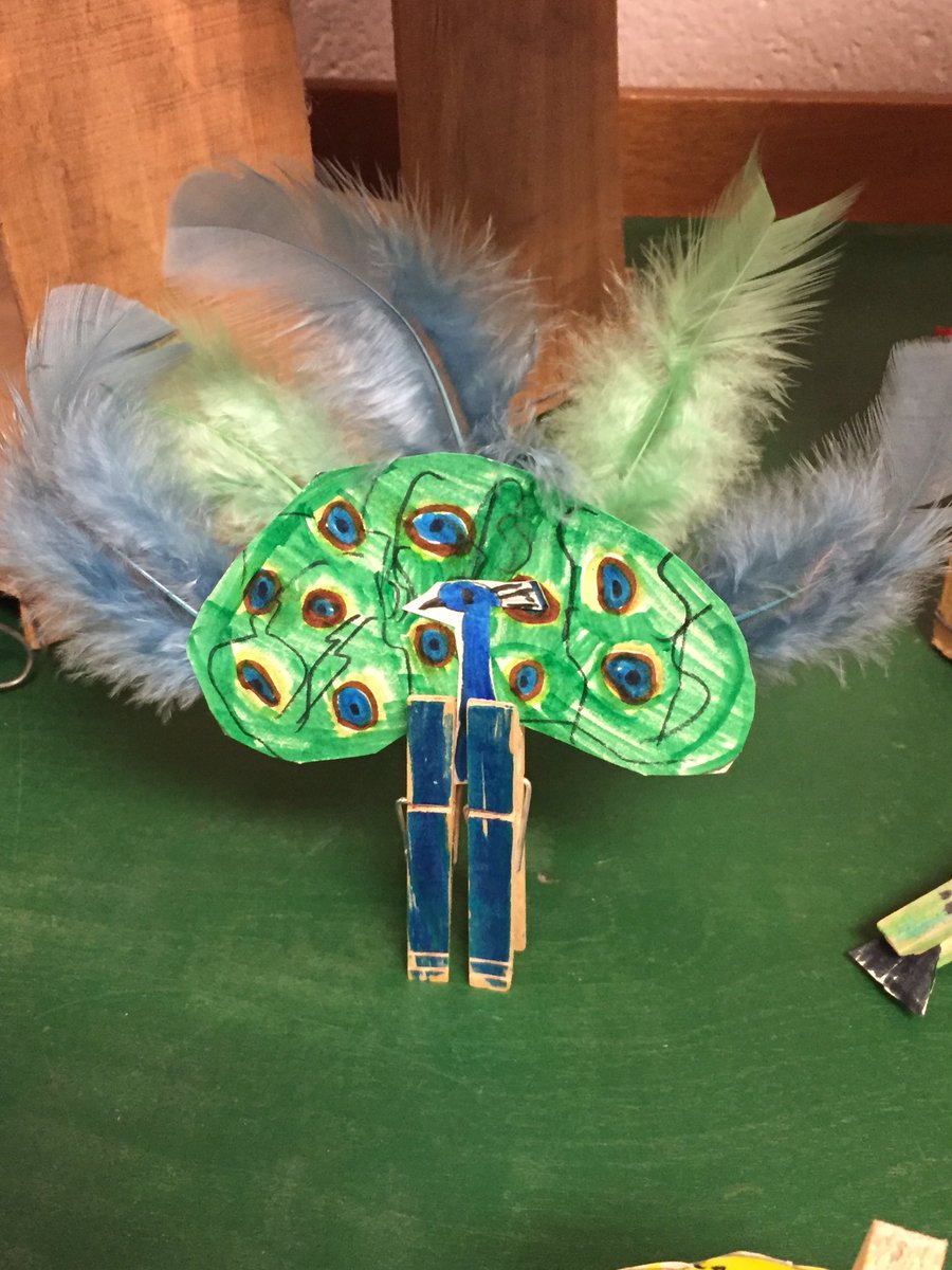 Designing clothespin animals: peacock, cheetah, meerkat family.