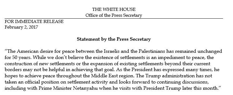 @WhiteHouse statement on Israel says "new settlements...may not be helpful in achieving that goal [of peace]"pic.twitter.com/C7aPJeL4pz