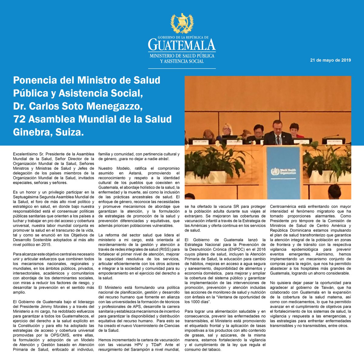 La 72ª Asamblea Mundial de la Salud inició sus sesiones en Ginebra. Mira el resumen de la apertura y la participación de la región de las Américas🌎 La delegación de 🇬🇹la lidera y el Viceministro de Atención Primaria de Salud⬇️