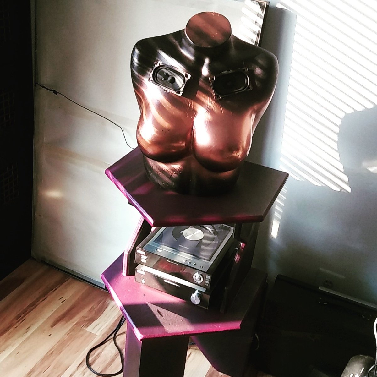 Morning light through the blinds sets off the stand I built for my new speakers.