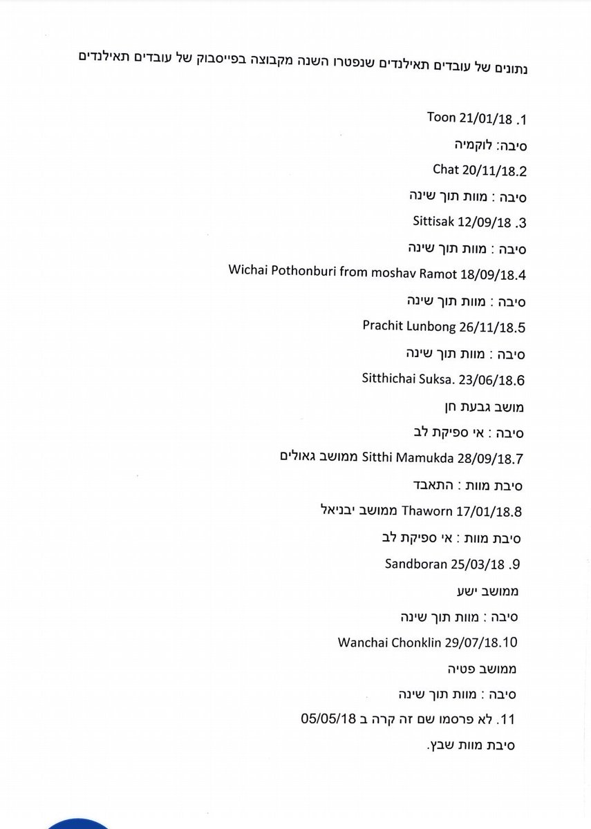 #סדריום אחרי תנאי העסקתם של פועלים מתאילנד בחקלאות בישראל.@NOFARMOS תביא נתונים על 11 מקרי מוות של פועלים ב2018. גם במקרים שיש סיבת מוות אין לכך הוכחות רפואיות. הנה כאן, 11 מקרי מוות בשנה אחת.pic.twitter.com/j5LlVxdxnU