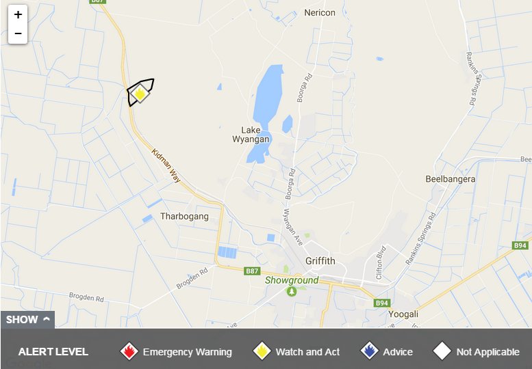 The LAT being sent to the Kidman Way Fire NW of Griffith. Property may be under threat. Kidman Way is close avoid the area
