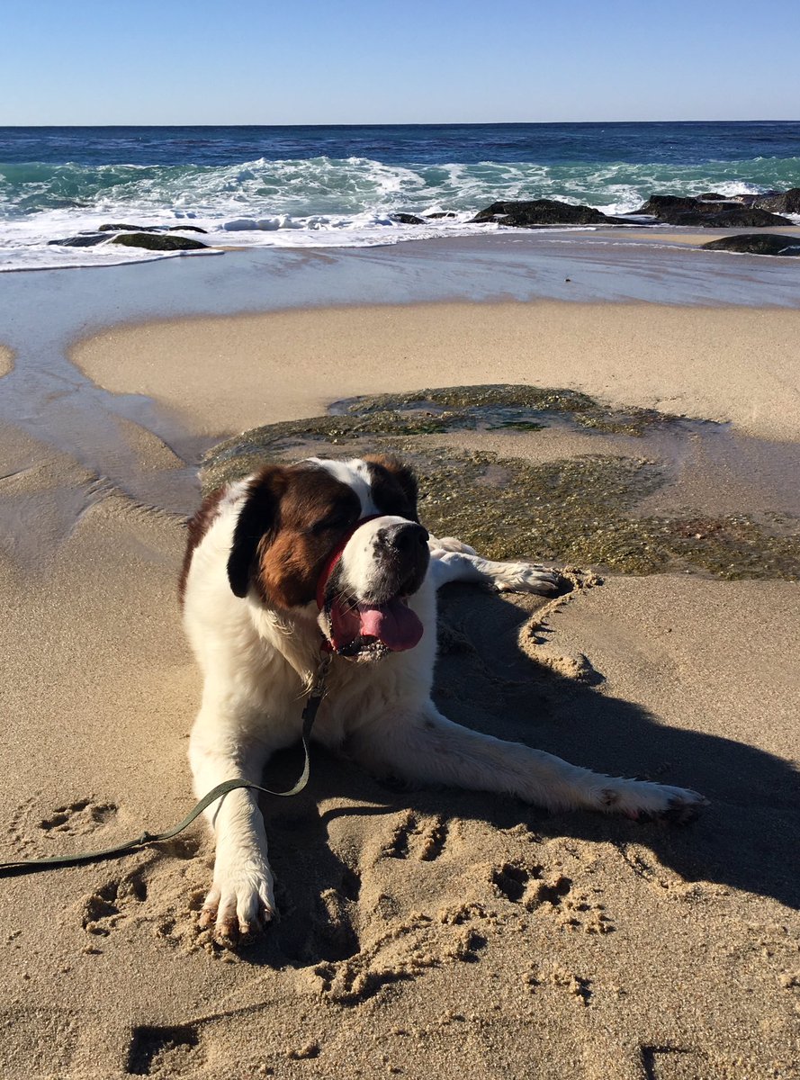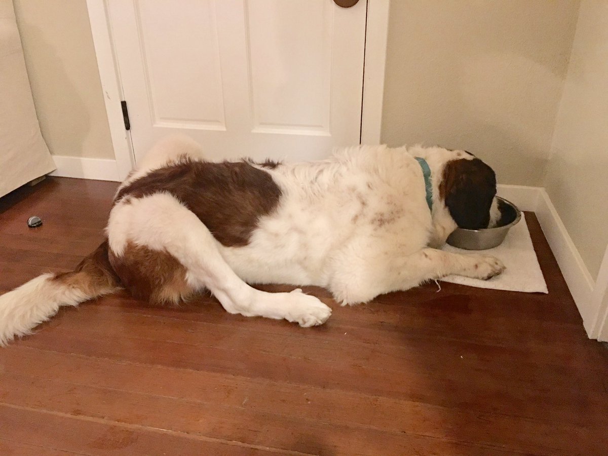 7. Bernard insists on laying down to drink :) We are now in Carmel for a few days & we have our first day out with him tomorrow meeting people.