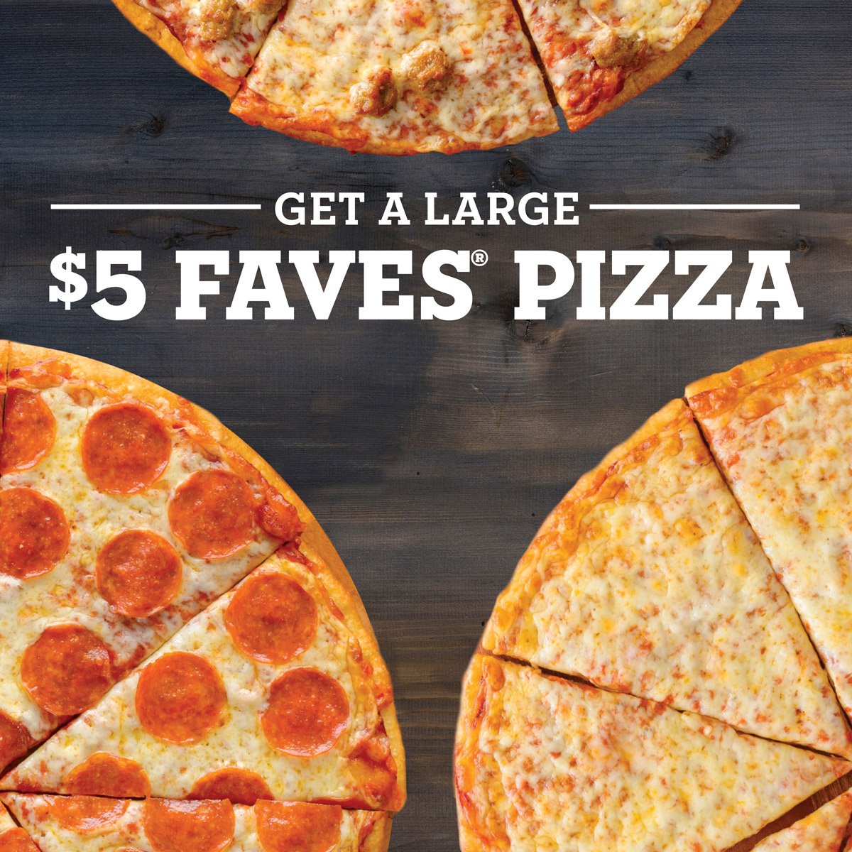 Pick up our value-priced FAVES pizza in your choice of cheese, pepperoni, or sausage for only $5 each.