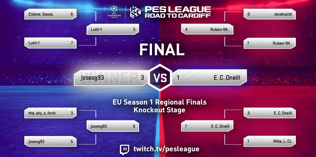 @E_C_Oneill v@josesg93 in the#RoadToCardiff EU Season 1 Final for $20,000 live now at http://www.twitch.tv/pesleague pic.twitter.com/S1za7SeZhp