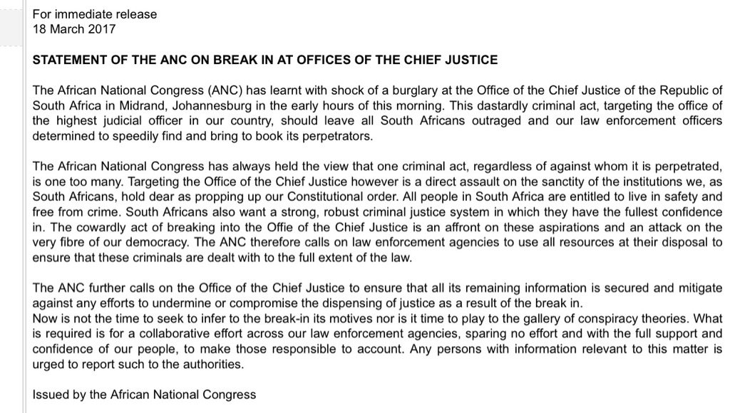 #ChiefJusticeofficebreakin a) Spy tapes saga pending; b) SASSA Case pending; & c) Nkandla case review pending;pic.twitter.com/3ON6vetqfo