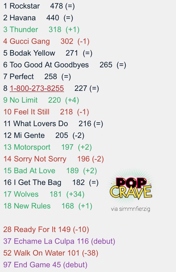 #Hot100;#rockstar holds at #1 for a 7th week,#Thunder reaches a new peak,#Wolves jumps into the Top 20 &#EchaméLaCulpa debuts at #37.pic.twitter.com/78tQw5JE1H