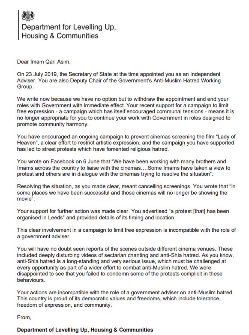 Text of the letter sent to Imam Qari Asim, telling him he will no longer be used as a government advisor after his role in organising the protests against