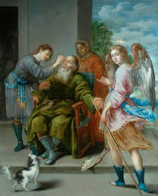 Tobias uses fish gall to restore father's sight. Odd moments of Old Testament from Antonio de Pereda, 1652.