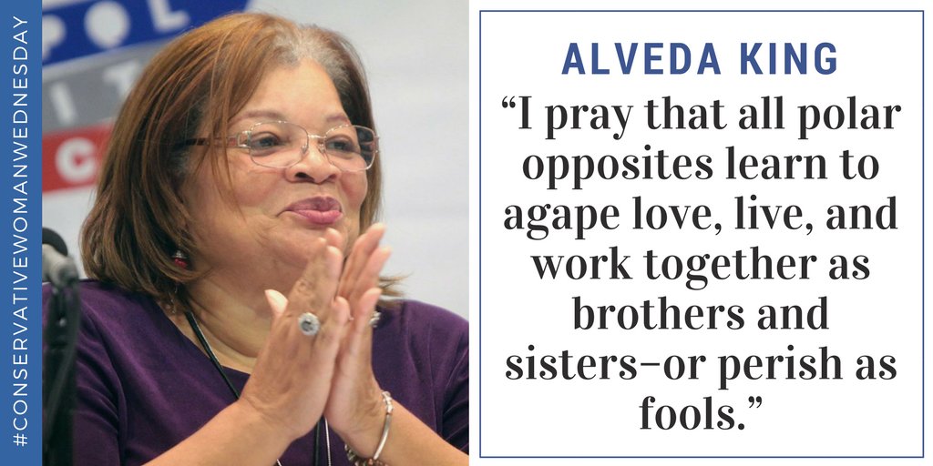 #ConservativeWomanWednesday is@AlvedaCKing! She is the niece of Dr. Martin Luther King Jr. and the daughter of Alfred Daniel Williams King. She is an author, Conservative activist, and former Congresswoman representing Georgia.pic.twitter.com/J8W7PG5r2P