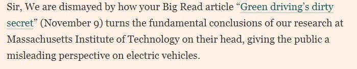 To everybody who flogged that FT article on CO2 last week as proof of how flawed EVs are, Here's what the actual study authors at MIT said about their work. Same conclusion as us: EVs emit lower CO2 per km even in coal-heavy parts of the grid. https://www.ft.com/content/d14b6c8a-c61e-11e7-b2bb-322b2cb39656 …pic.twitter.com/03vMdi7bAL