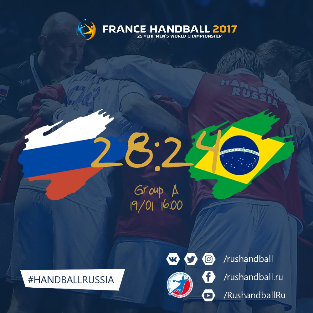 Матч окончен! Россия - Бразилия 28:24! Россия заняла 3 место в группе А и сыграет в 1/8 финала в Париже!
