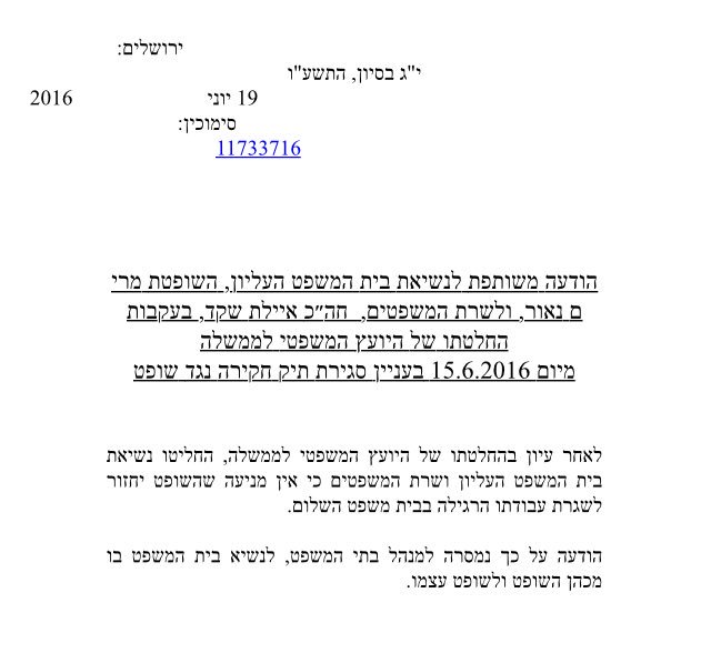 11. שרת המשפטים ונשיאת ביהמ״ש העליון הודיעו שאין מניעה להחזיר לעבודה את השופט שנחשד בביצוע עבירות מין בביתו