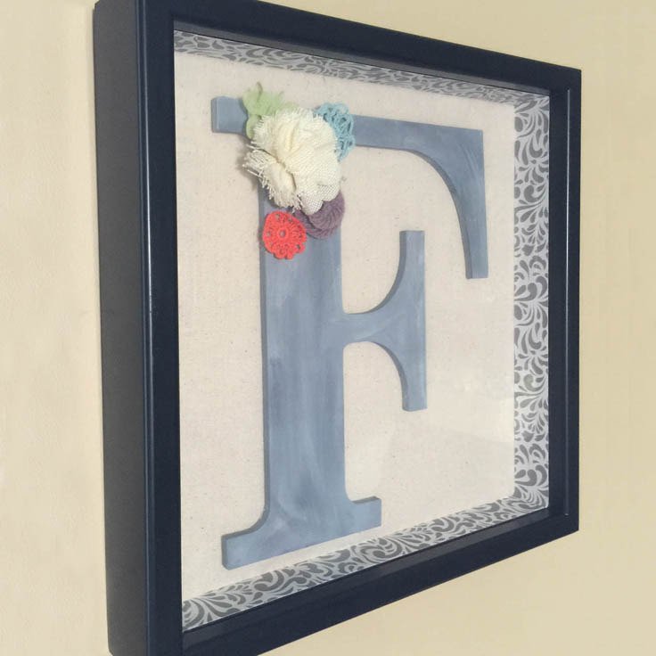 Take a shadow box, add your initial, along with paper and embellishments to create meaningful