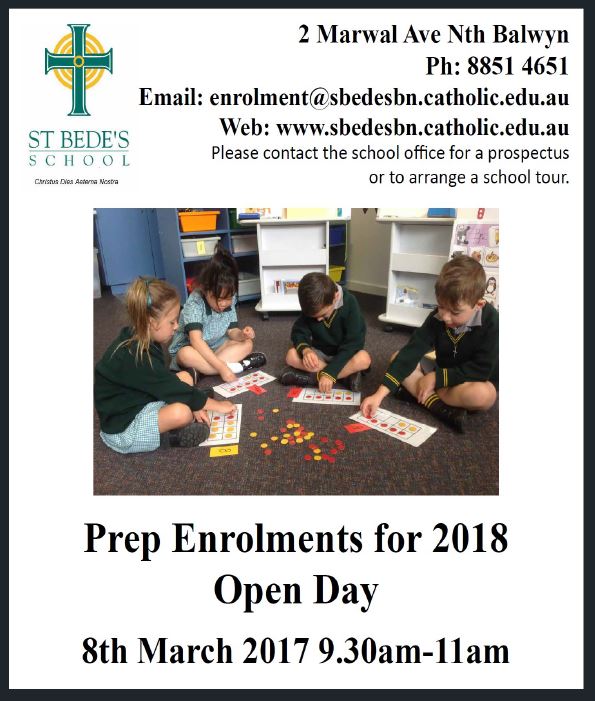 Open Day at St Bede's on March 8th, 9:30 - 11:30. We welcome enrolments for 2018 and beyond. Spread the word about our wonderful school!pic.twitter.com/WefXifa2iU