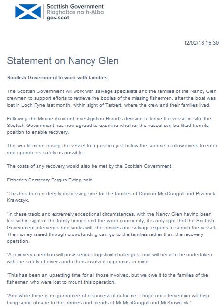 The Scottish Government will work with salvage specialists and the families of the Nancy Glen crewmen to support efforts to retrieve the bodies of the missing fishermen,