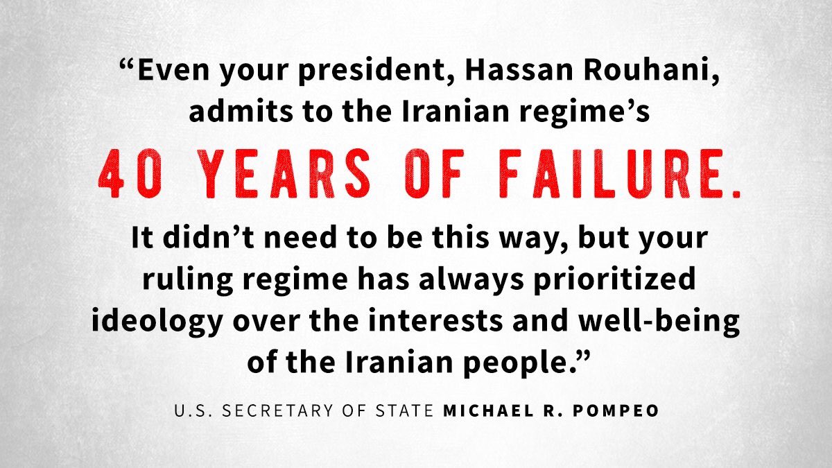 @HassanRouhani به ۴۰ سال شکست رژیم ایران اعتراف می کند. نیازی نبود اینطور باشد، اما رژیم حاکم شما همواره ایدئولوژی را بر منافع و رفاه مردم ایران ترجیح داده است.#چهل_سال_شکستpic.twitter.com/il6kFrWiBV