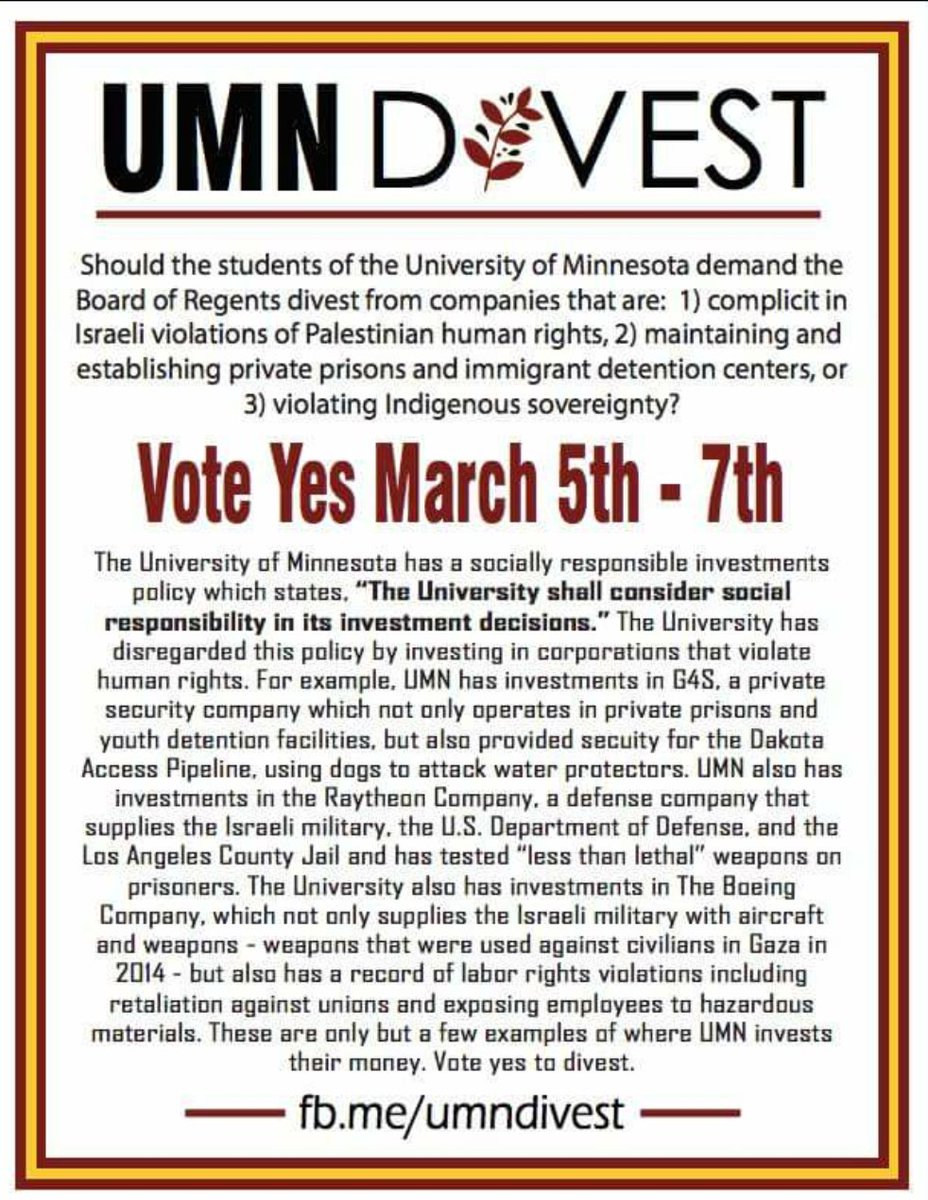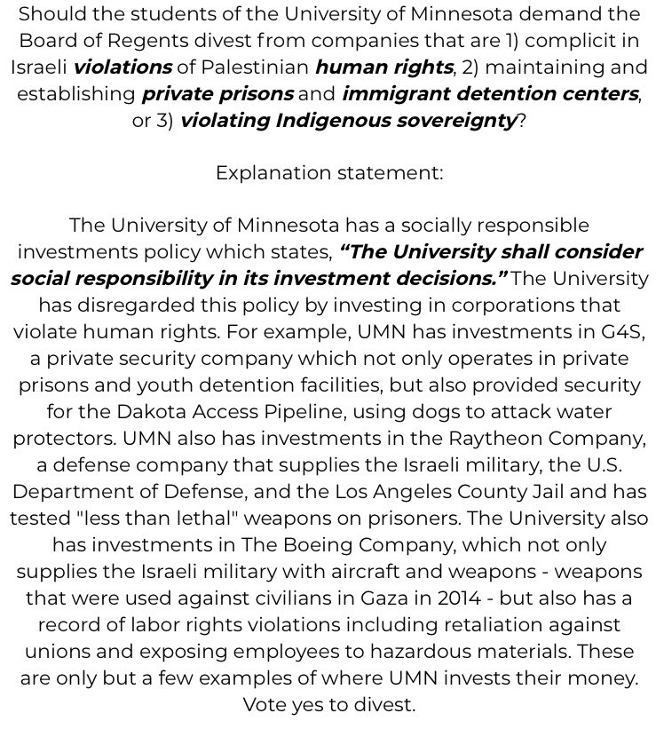 UMN Divest is a collective effort. A coalition of badass activists worked hard to bring his referendum forward. Check out our Facebook page for a full list of endorsing groups